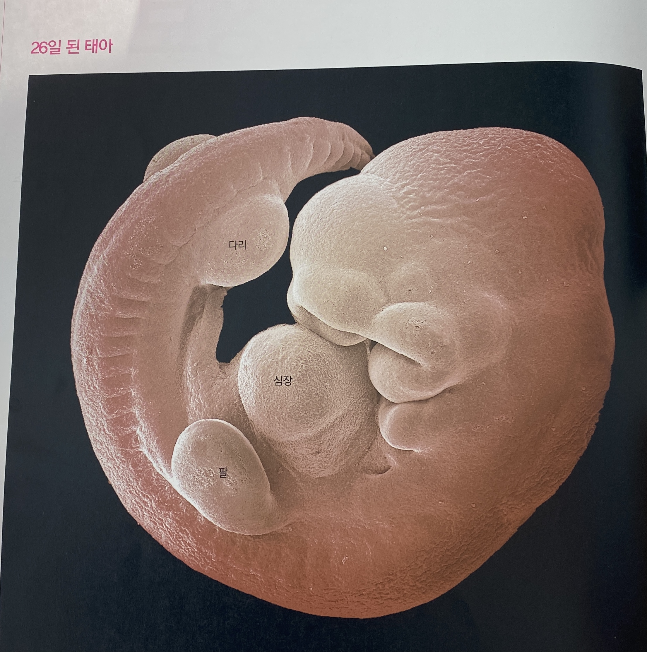 임신 첫 달이 끝나갈 무렵의 태아는 둥그스름한 머리에 등이 아치형이며 꼬리가 기다란 척추동물의 모습을 갖추고 있습니다. 단일세포였던 수정란이 불과 4주 만에 수백 개의 세포로 분열해 신경, 근육, 혈관, 골격 등 인체의 주요 계통을 갖춘 조직화된 세포로 발달한 것입니다.